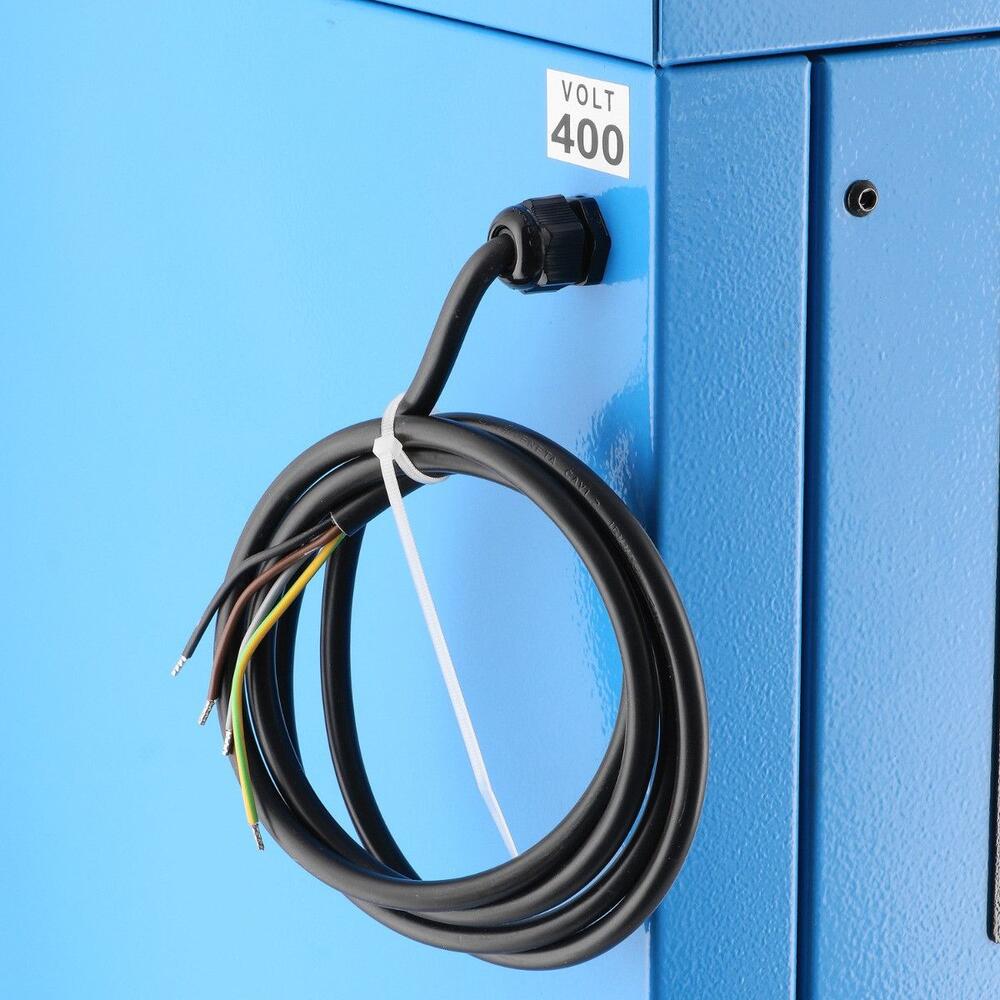Den er drevet på 400 V trefaset strøm og leverer en stabil luftydelse på ca. 220 l/min, hvilket gør den velegnet til en række pneumatiske opgaver og værkstedsarbejde.