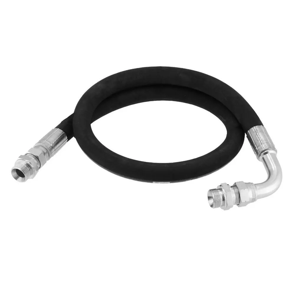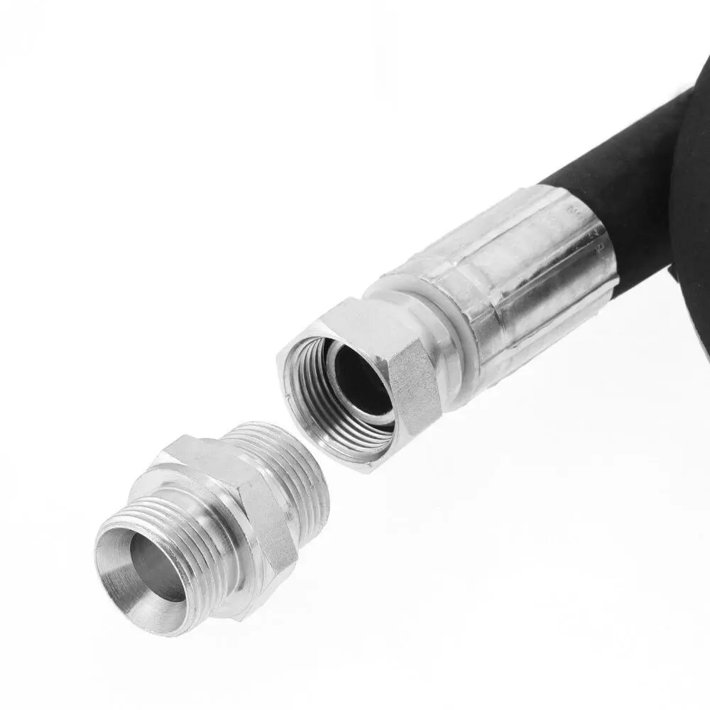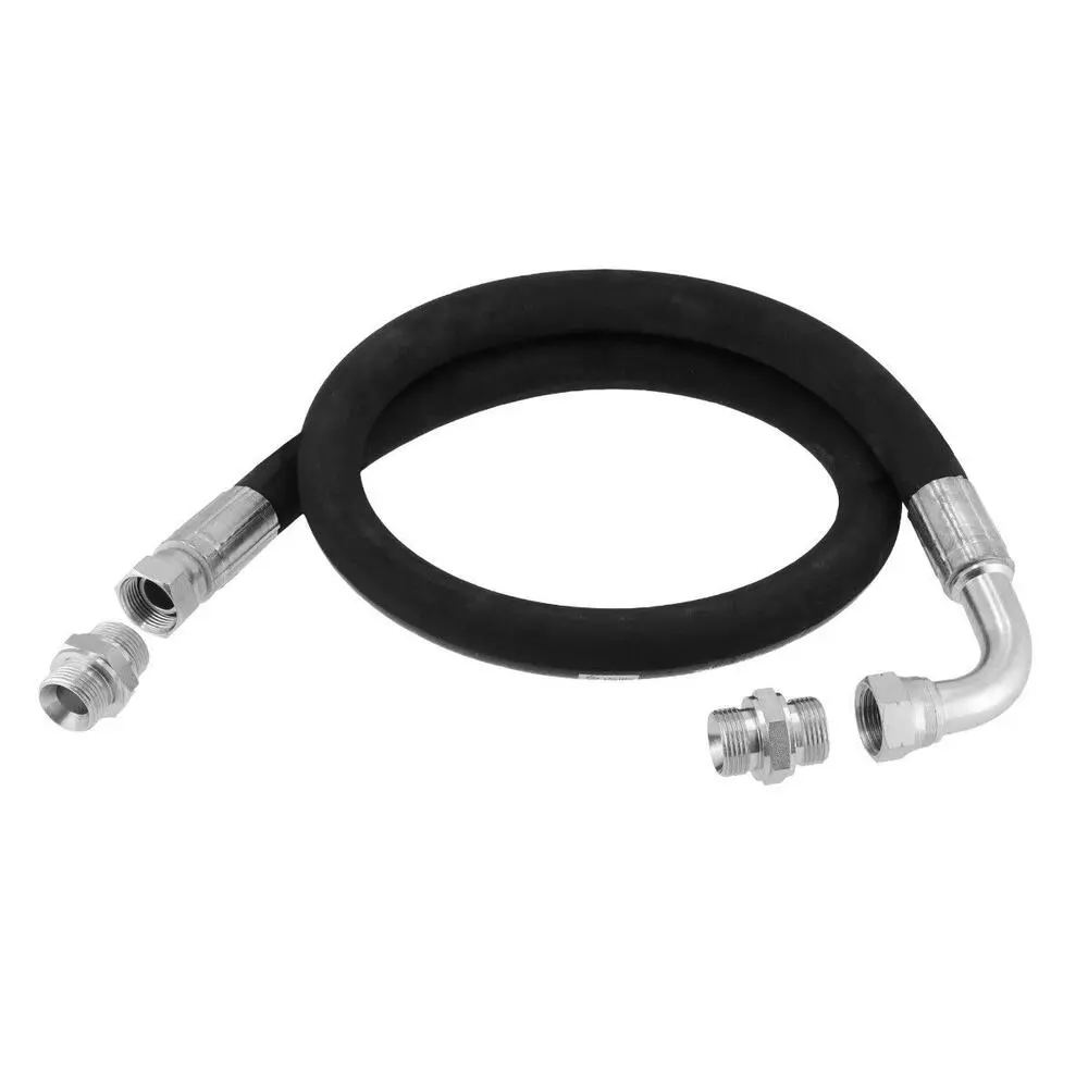 Forstærket 1,5 m tilslutningsslange med max 88 bar og 1″ tilslutning, inklusiv lige og vinkel fittings for hurtig og fleksibel montering i trykluftsystemer.