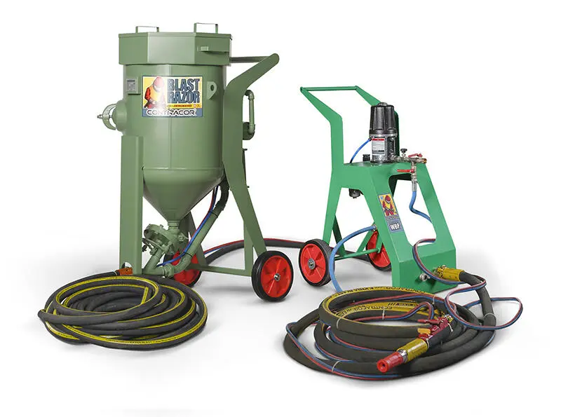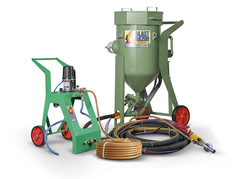 Komplet rustfri vådblæsningspumpe fra Contracor til effektiv vådsandblæsning med op til 92 % mindre støv. Leveres i transportabel ramme med filter/regulator, fugtudskiller og adaptere til vandinjektion.